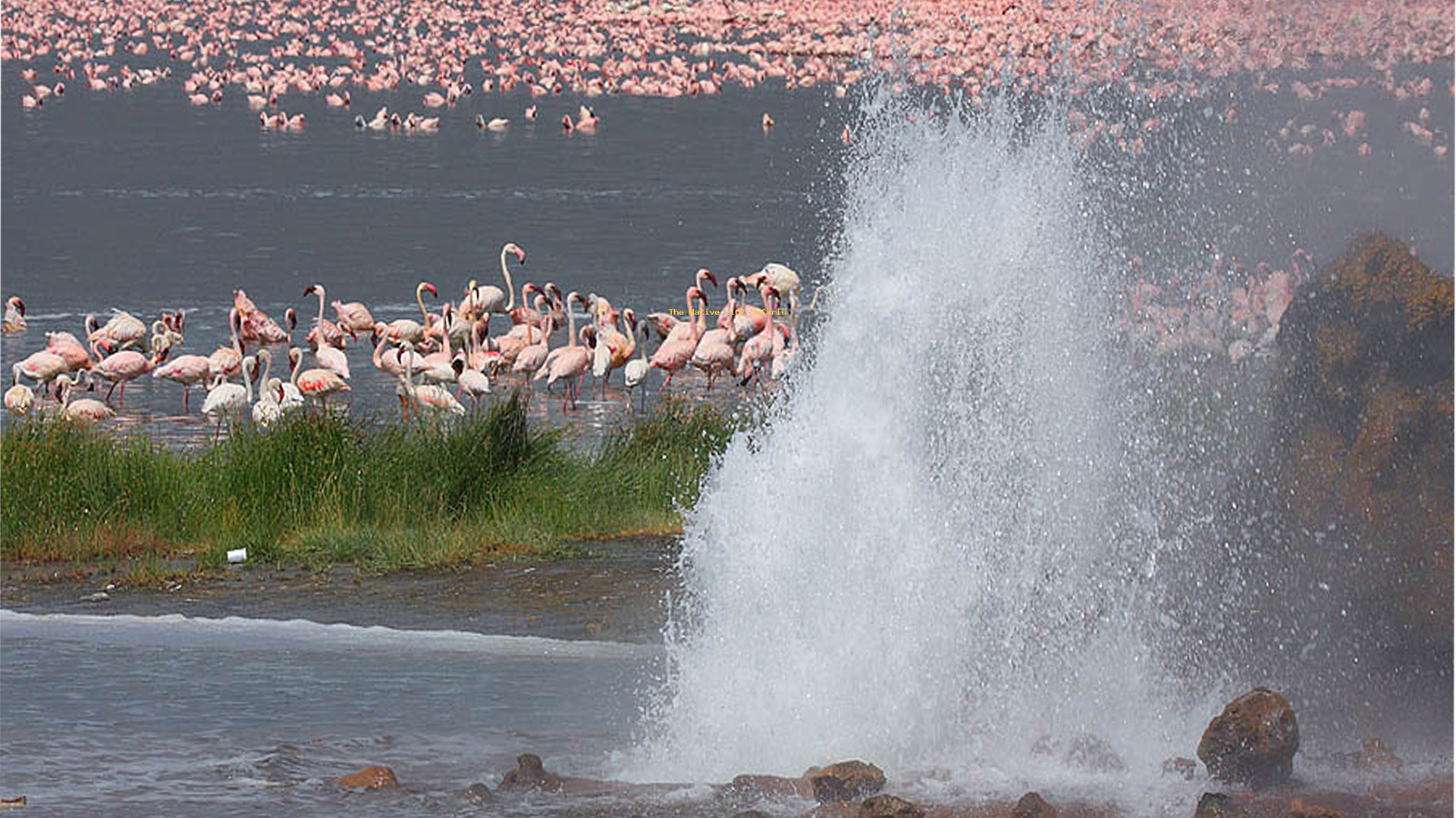 Lake Bogoria National reserve is an important conservation area in Kenya holding regionally and nationally endangered species like Greater Kudu and other mammals. The reserve has unique physiographic feature and geothermal manifestation due to its history. Lake Bogoria is a world heritage site and is the deepest alkaline lake in Kenya with numerous alkaline hot springs that contribute significant inflow into the lake. The geysers and hot springs are the major attractions which are at the central basin of the lake. This reserve is rich in biodiversity and the lake is an important stop-over point for the northern avian migrants. The Siracho Escarpment, an extension of the upper catchment’s Laikipia escarpment, on the eastern part of the lake has various gorges and vegetation types. The rocky outcrops which host numerous rock hyraxes have an unimaginable potential and supports enormous scrubs. The rock and lava outcrops by the springs are very attractive and ideally located to stand rest on and soak up with steam from the boiling water below. Animals found here are the common mammals like Greater Kudu, Burchell’s Zebra warthogs, Forest hog Impala, Klipspringers, Cape buffalo, Patas Monkeys among others. Predators include genet, serval cat, cite and white tailed mongoose cheetah. There are several reptiles including monitor lizard, agama lizard, tortoise and a number of snakes such as Black mamba spiting cobra and puff adder. Over 373 species of birds have been recorded in the reserve and its surroundings including over 50 migratory species making it one of the richest birdlife areas in Kenya Important Bird Areas. The Lake holds huge congregations of lesser flamingos. Other water birds found in the lake include migratory waders such as Ruff, Curlew sandpiper, little stint Tawny eagle, among others.